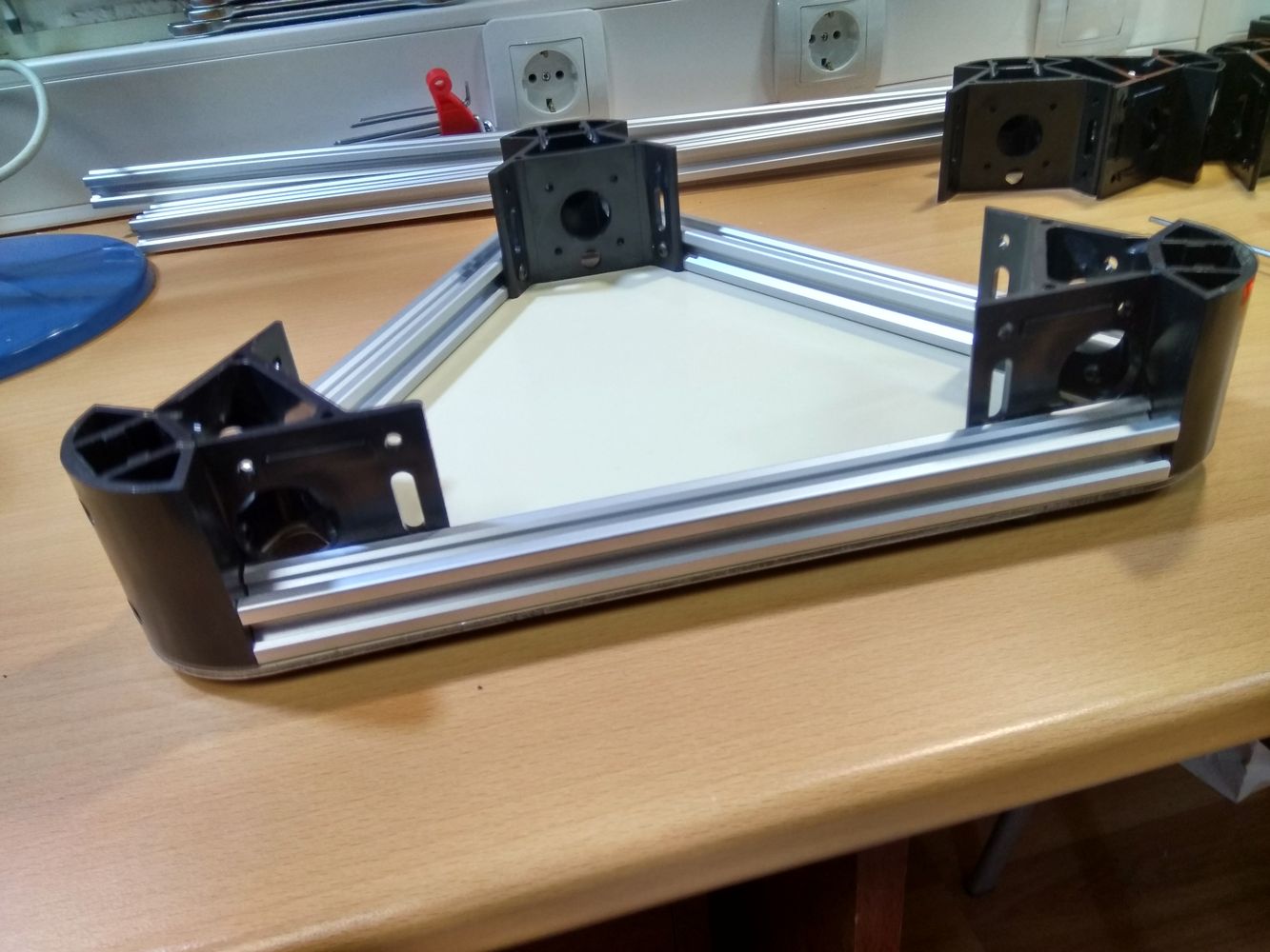 Использование в основании фрезерованной из композита площадки, закрепленной через Т - гайку по всему периметру нижнего яруса аллюминиевых направляющих.